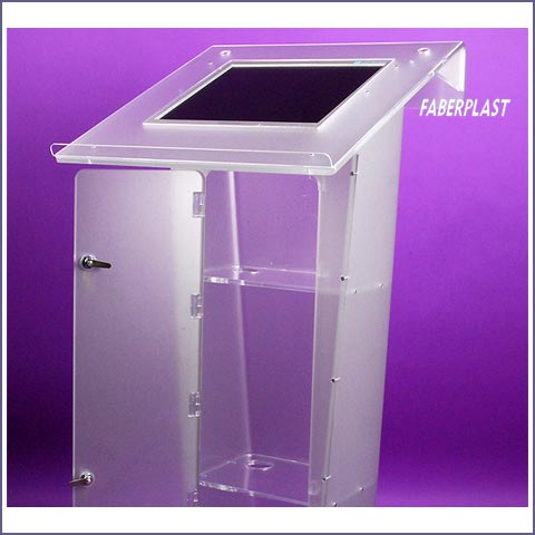 Acrylic plexiglas lectern event. Made specifically to incorporate a touch screen or PC monitor integrated and protected from access by the public Connection. Suitable for functions, events, fairs and other uses in retail outlets and exhibitions. Made of clear acrylic perspex (Plexiglas-pmma) and decorated with translucent vinyl nuanced.