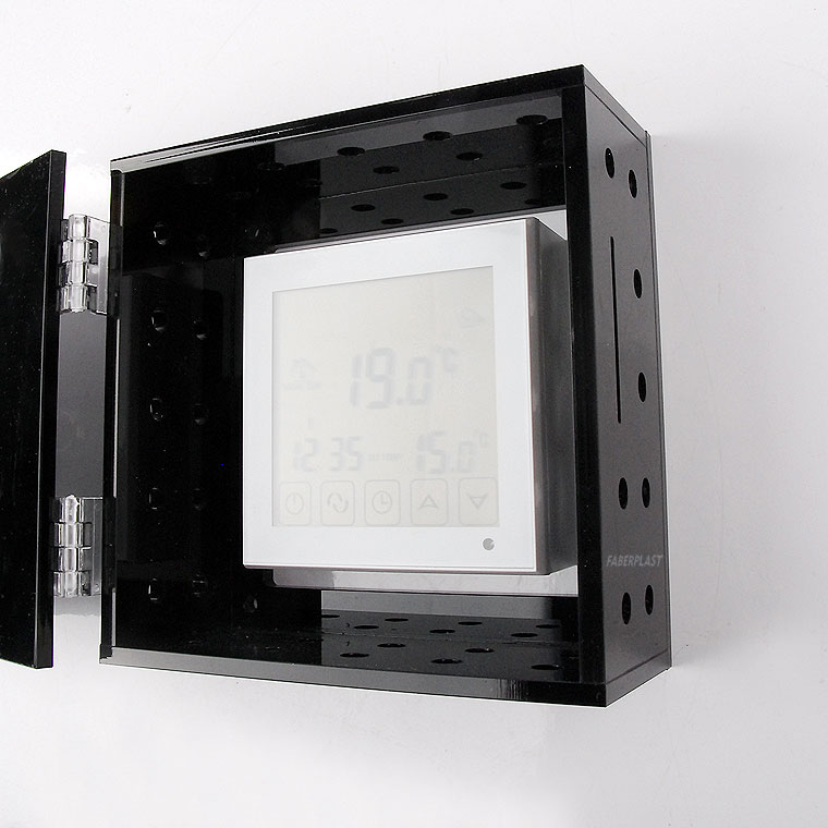 Plexiglas box made for the safety of THERMOSTATS AND OTHER APPARATUS in wall format with casing in White or Black.