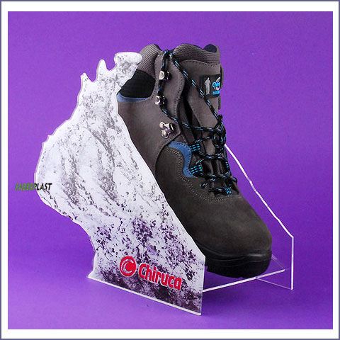 Acrylic plexiglas display exhibitor format for counter, showcase or display case. Custom made for the brand CHIRUCA plates printed with transparent acrylic perspex (plexiglas, pmma) by direct digital print design and corporate logo.