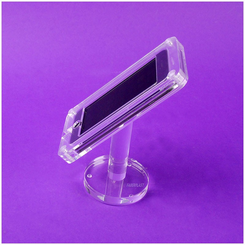 Acrylic plexiglas display exhibitor for tablets and smartphones (iPhone - Ipad Mini) made format for desktop, display case or desk. It has housing with cover and screws, and can be used without front cover for greater access to the terminal.