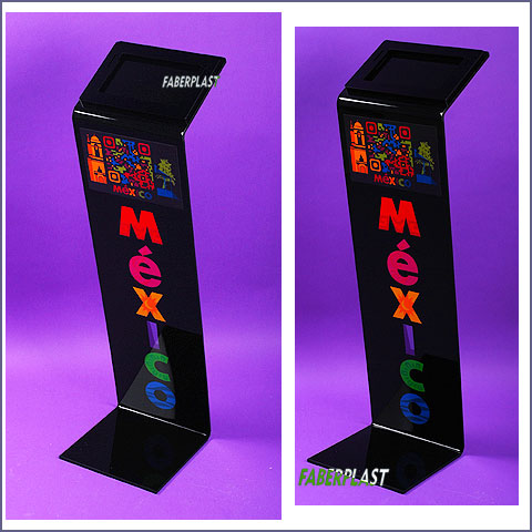 Acrylic advertising display surface format prepared to adapt an iPad, digital printing and labeled with customer logo. Made of black acrylic plexiglas (Perspex-pmma).