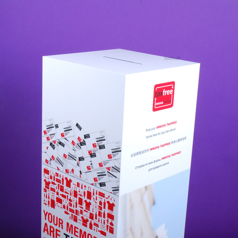 Urn advertising and promotions of the company Innova tax free. Made to measure in large format floor format with pvc foamed matt white (Lyx foam-Foamapan) and labeled with digital printing on all four sides.