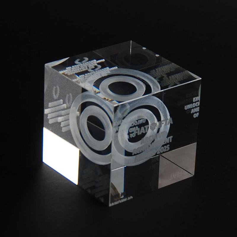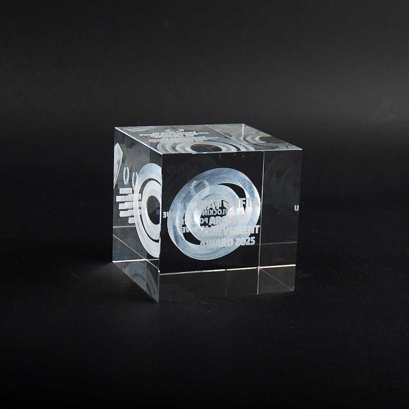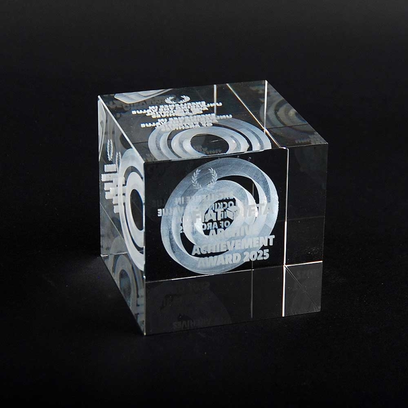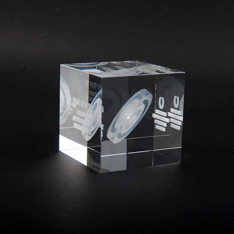Transparent cubes handcrafted from glass and packaged in a special corporate gift box. 3D laser engraved with images and text according to the customer's requested design. Solid optical glass with technology that creates thousands of microcracks inside the glass to achieve stunning clarity and detail. Made in Spain.