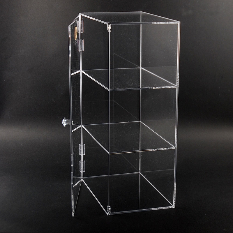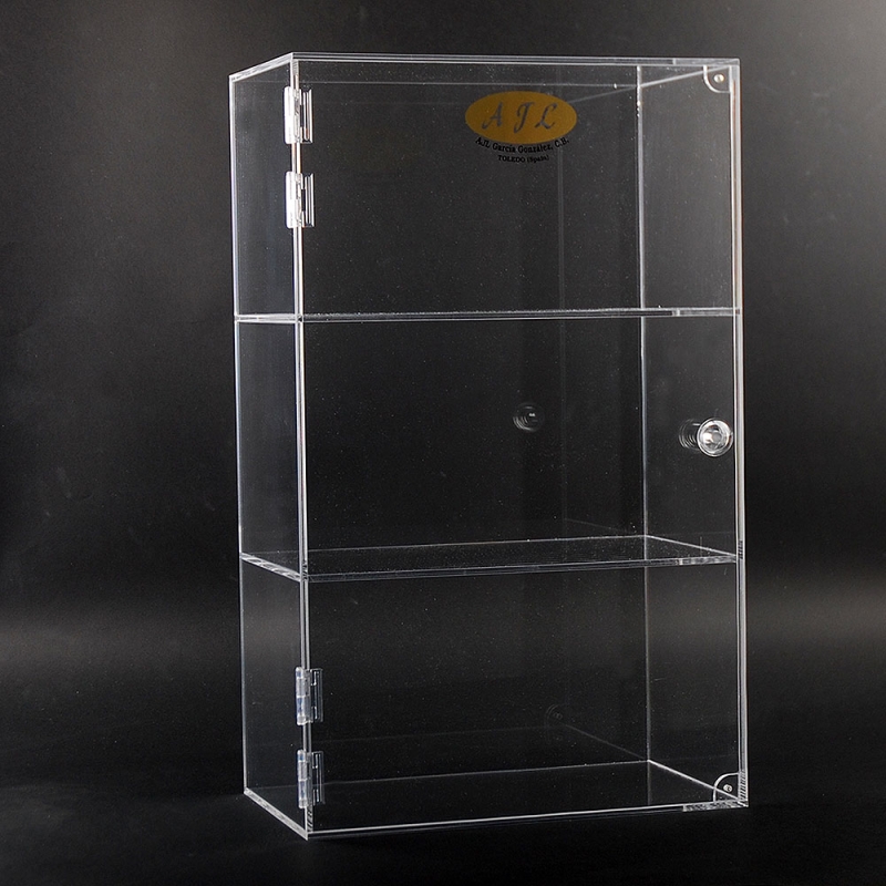 Customized showcase with hinged door and 3 holes for placement on table or counter, handcrafted with transparent acrylic perspex plates (Plexiglas®-PMMA). Marked with the customer's logo in digital printing using high quality and resistant ECO-UV inks. Smooth edges and polished colourless extra bright.