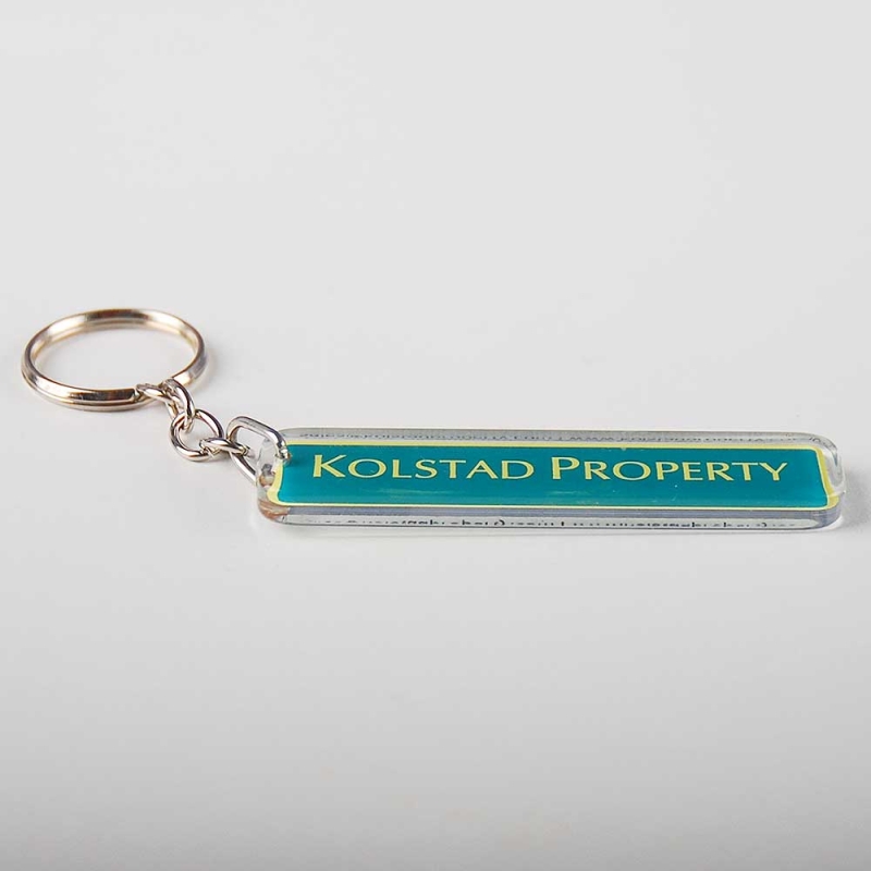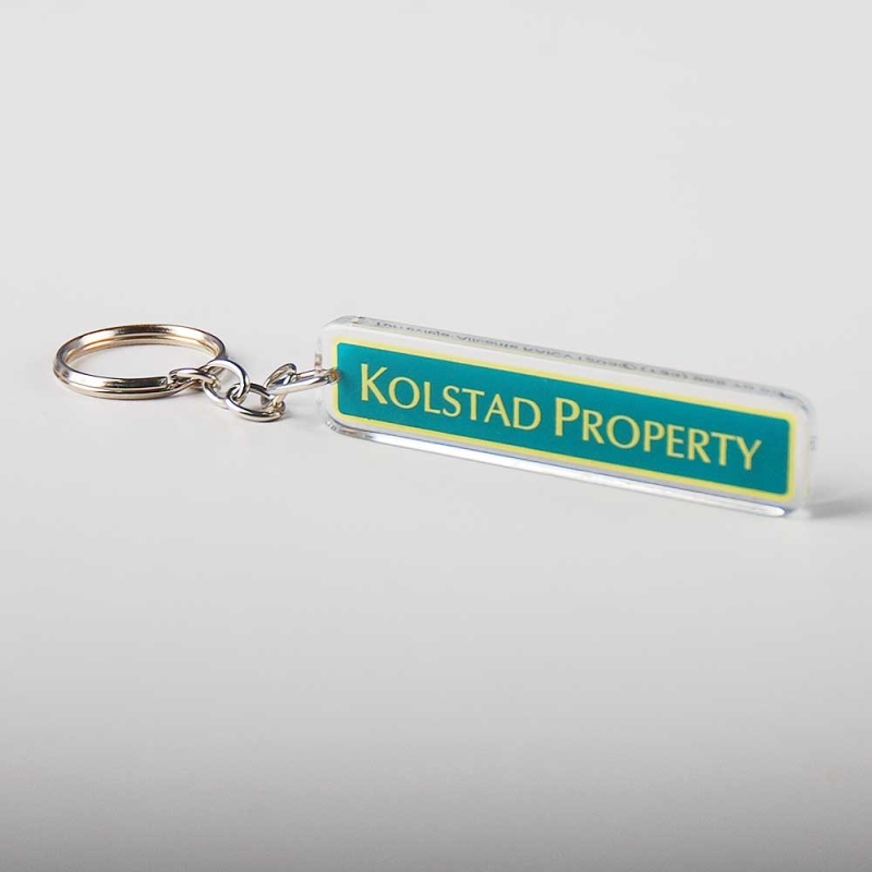 Acrylic plexiglas keyrings made ad-hoc as merchandising of the company KOLSTAD PROPERTY.