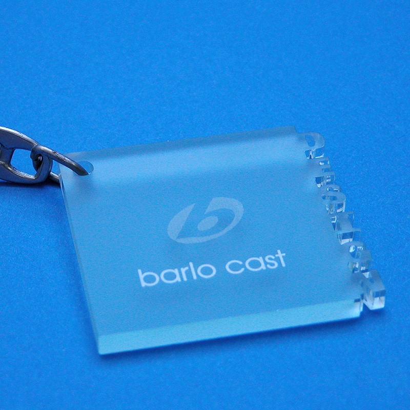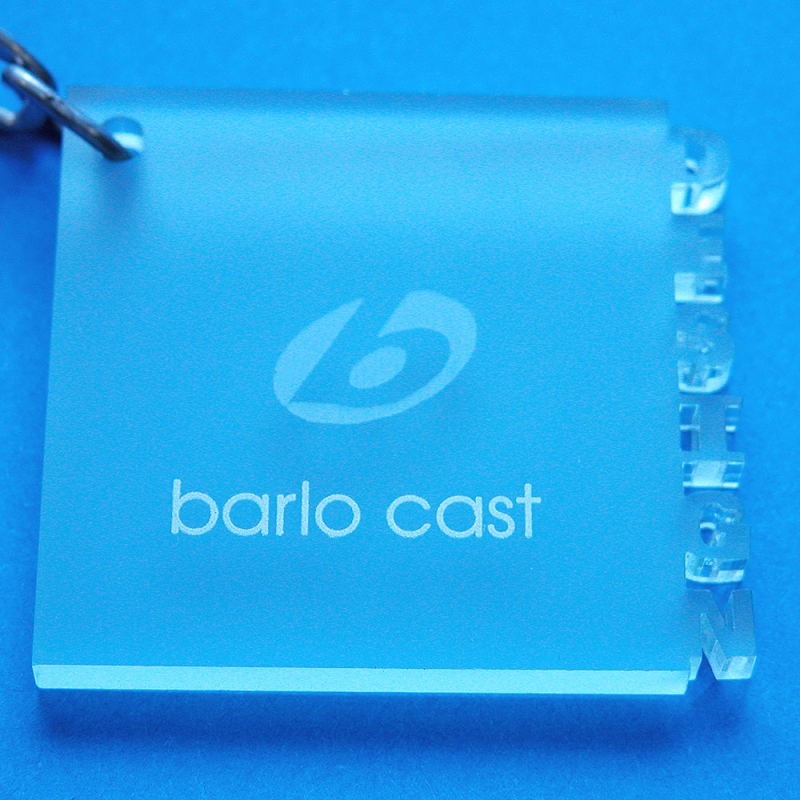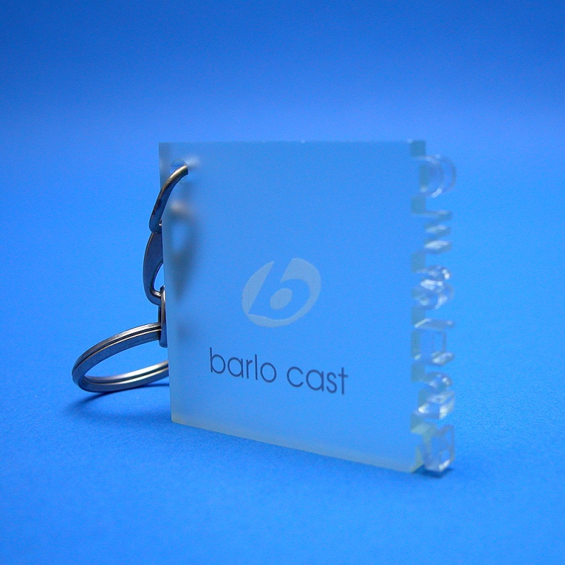 Acrylic plexiglas keyring made for the company BARLO CAST. Made to measure plates tinged translucent acrylic perspex (Plexiglas, PMMA). Includes letters silhouetted by laser cutting and engraving.
