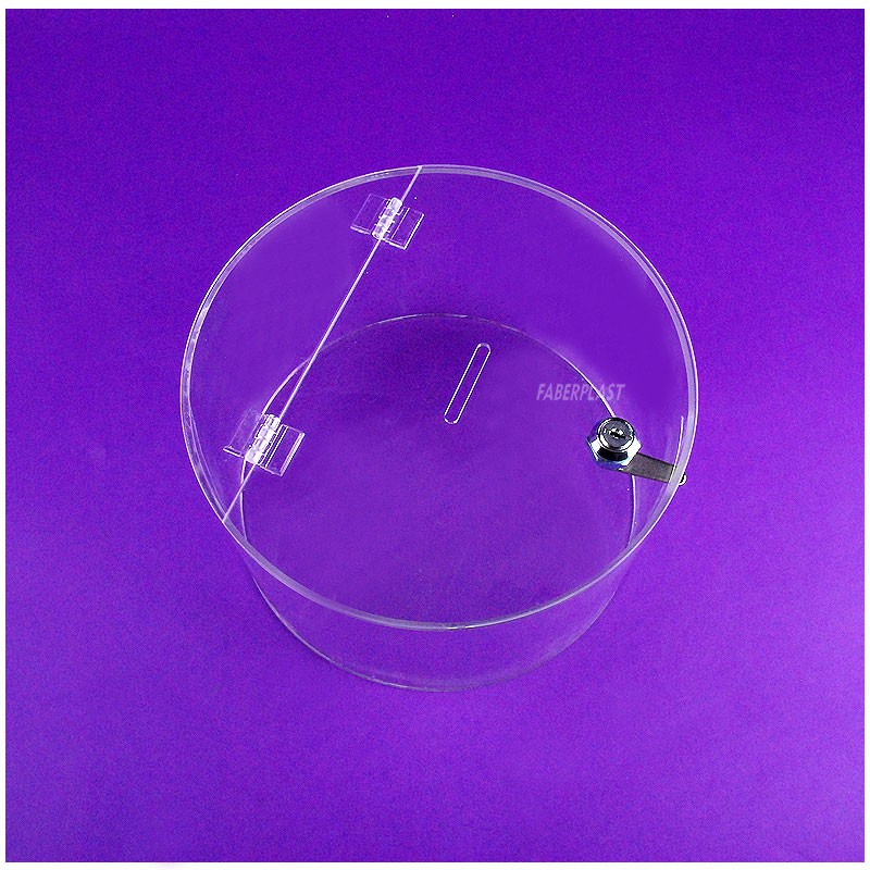 Acrylic plexiglas piggy bank CIRCULAR donation model, with wide tube format suitable for promotions, events, grants, and other uses.