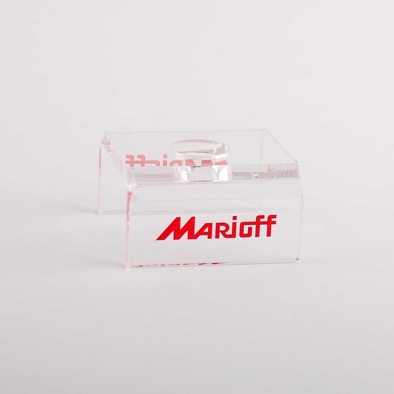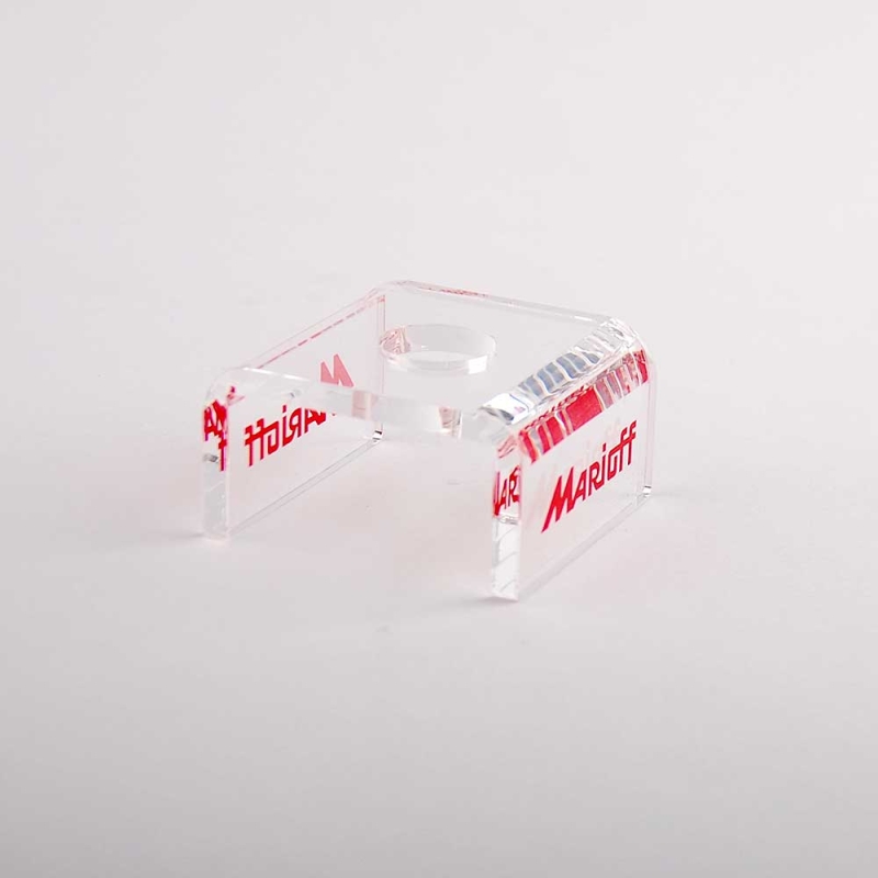 Small, transparent acrylic (Plexiglas®-PMMA) support part for installation in MARIOFF industrial systems. This part is processed using state-of-the-art, high-precision lasers. It includes digital logo printing using high-quality, durable ECO-UV inks with exceptional color clarity and depth. The edges are smooth and polished to an extra-glossy, colorless finish.