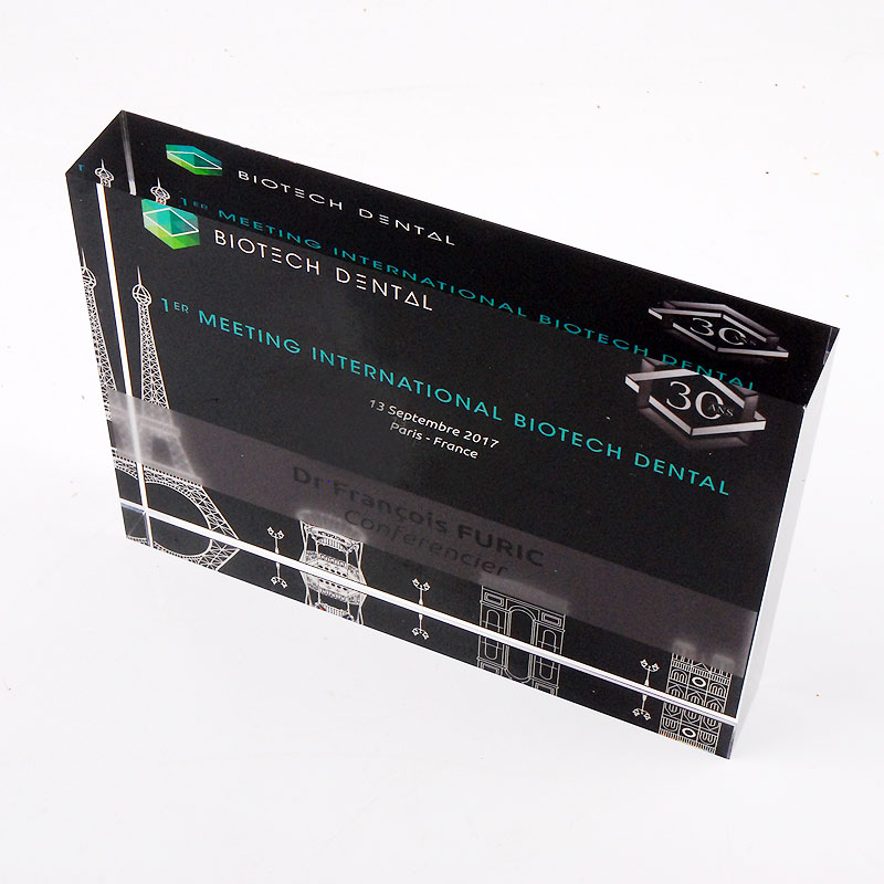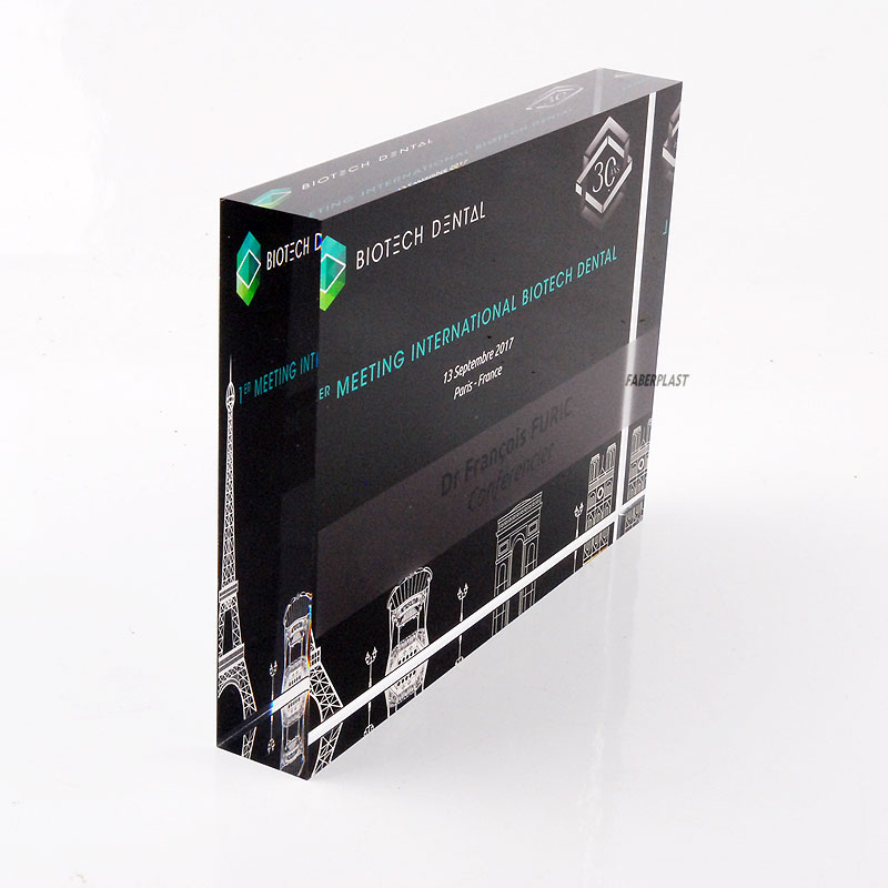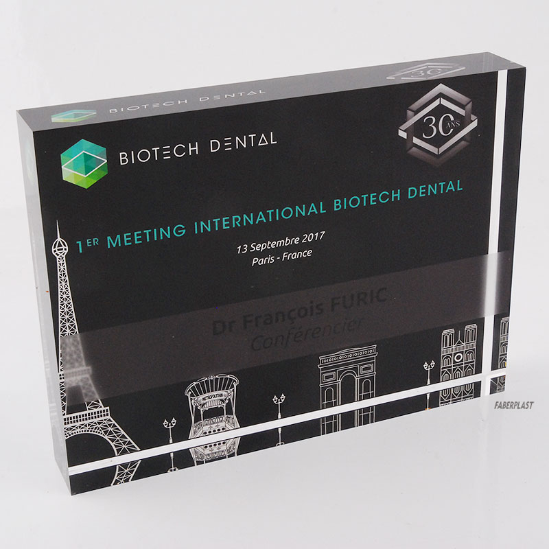 Acrylic plexiglas corporate block made to measure for the companie BIOTECH DENTAL. A perspex transparent plate (Plexiglas-pmma) with printed by high-quality direct digital printing with design, logos and texts provided by the client. No adhesives and an elegant finish.