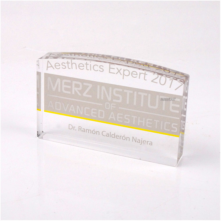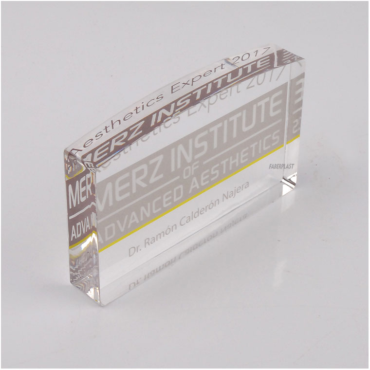 Acrylic plexiglas block made to measure for the company MERZ PHARMA. Made with clear acrylic perspex plates (Plexiglas-pmma) with smooth curved corner finishes and printed with high quality direct digital printing with texts and customer supplied design.