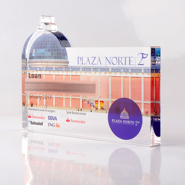 Acrylic plexiglas bloc made to measure PLAZA NORTE 2 with shape silhouetted by laser. Manufactured using transparent perspex plates (plexiglas-pmma) high thickness. It includes direct digital printing on two sides, with a design facilitated by the client and logos of collaborating entities.
