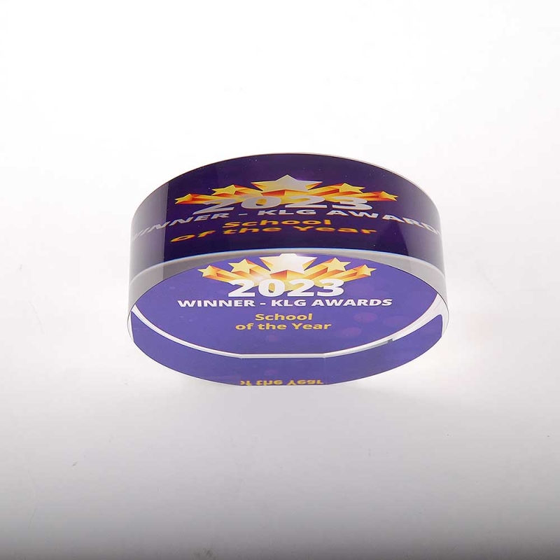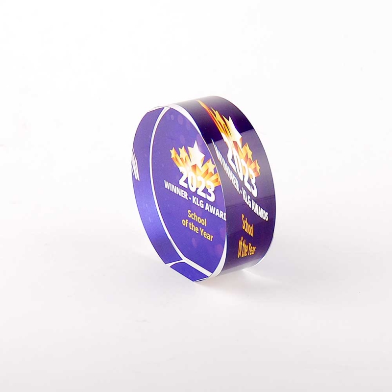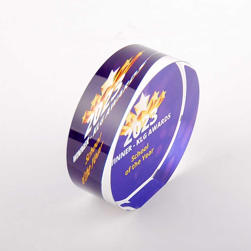Blocks with curved shape handmade with transparent acrylic perspex plates (Plexiglas®-PMMA) of very high thickness. Made in Spain. With digital printing and ECO-UV inks of high quality, great sharpness of colours of wide depth faithful to the design provided by the customer. Smooth and polished colourless edges with high gloss. A specialised and personalised finish for a great event. Congratulations to the award winners.