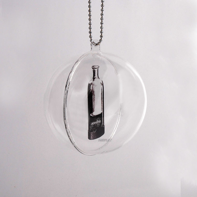 Acrylic Plexiglas SPHERE made to measure to hang on Christmas tree of the company ECOVIDRIO. Manufactured with transparent perspex plates (Plexiglas-pmma) printed in digital and dial with hook for pendant. Includes interior piece with suspended object effect.