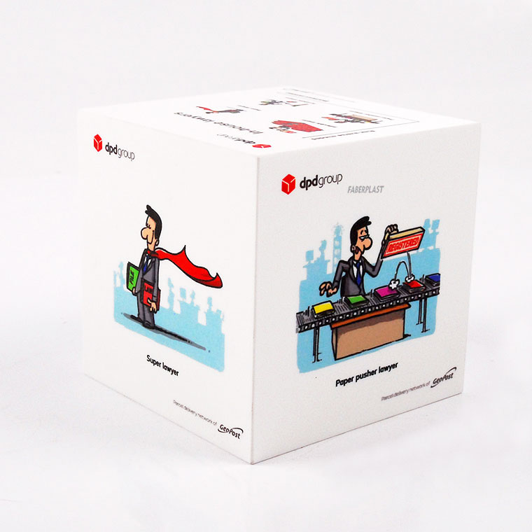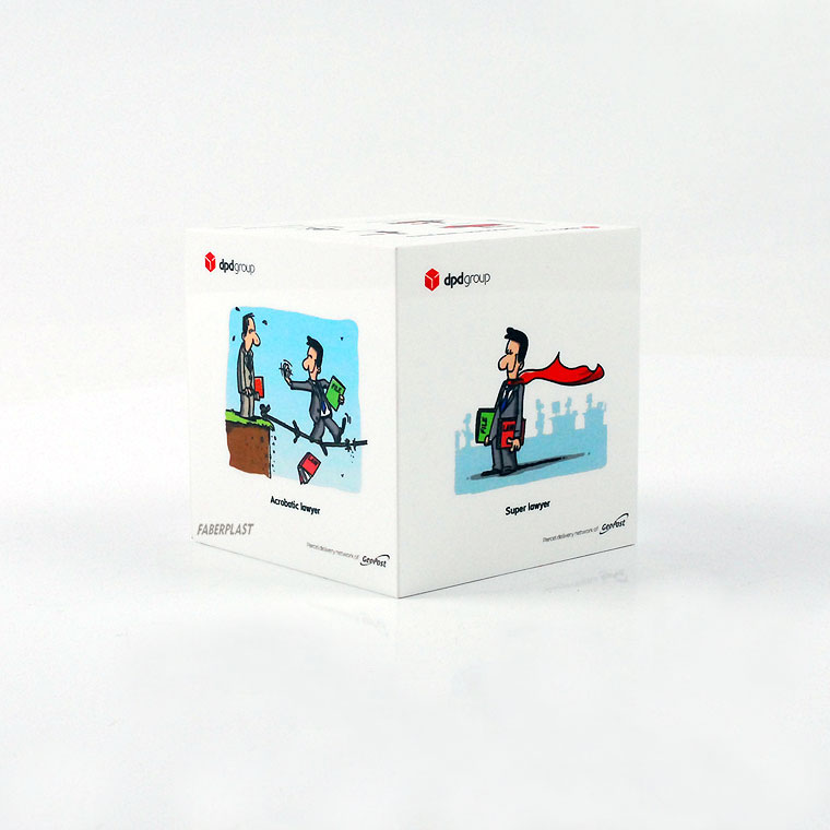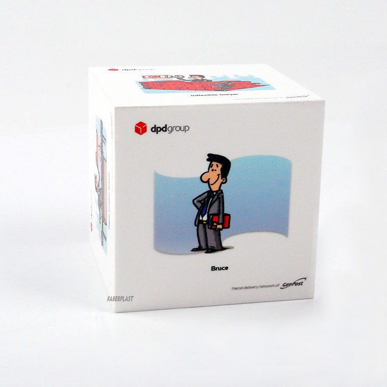 Promotional perspex cube made ad-hoc for the DPD Group company campaign.