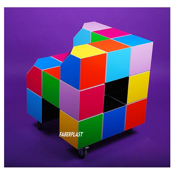Decorative chair “CUBYK” made in white FOAMAPAN (PVC foam) with a unique design, consisting of hollow cubes decorated in several colors. With a lateral holder designed to store a huge range of objects.