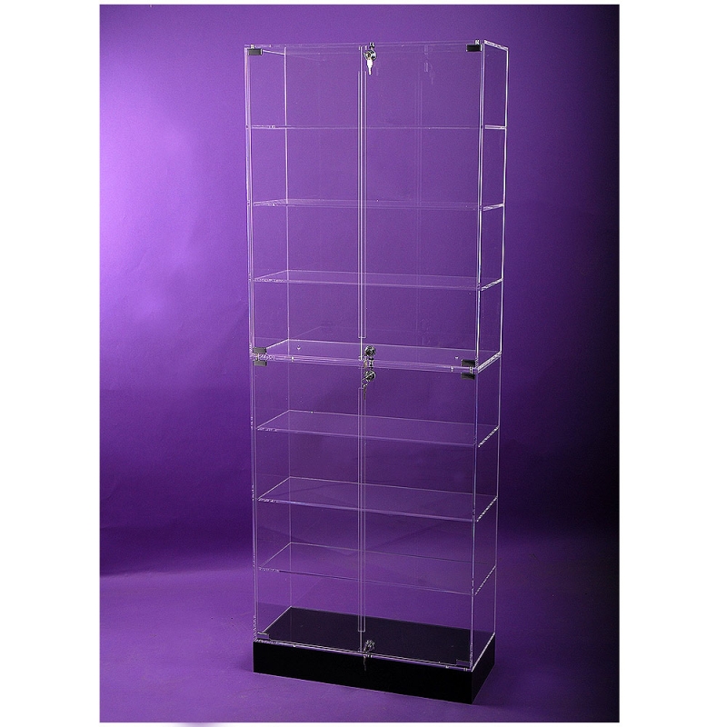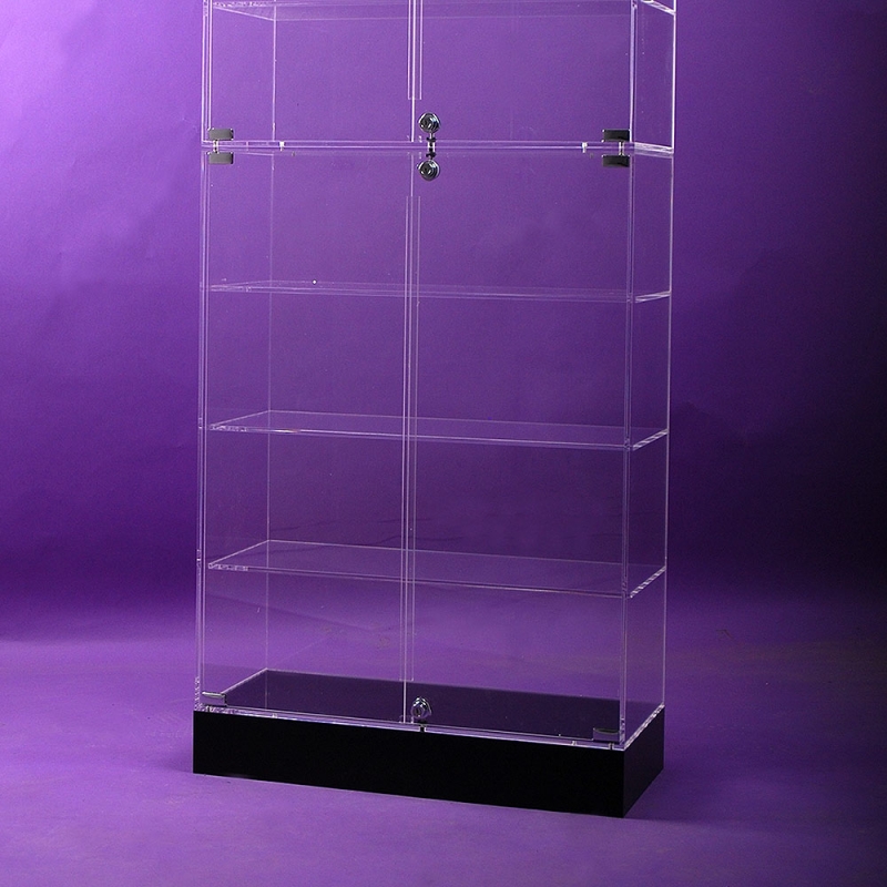 Plexiglas shelving transparent showcase with a BLACK BASE made to measure for product placement and display. Artisan manufacturing consisting of a double module and a construction with transparent and black perspex plates (Plexiglas®-PMMA) that incorporates a double door with steel hinges and locks.