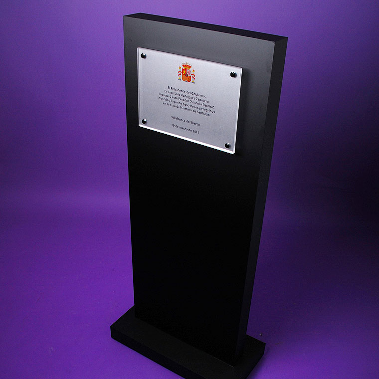 Matte black monolith made ??to PARADORES corporate board, made ??pvc matte black frame and transparent acrylic perspex plate (Plexiglas - PMMA) with digital printing in black and chrome spacers.