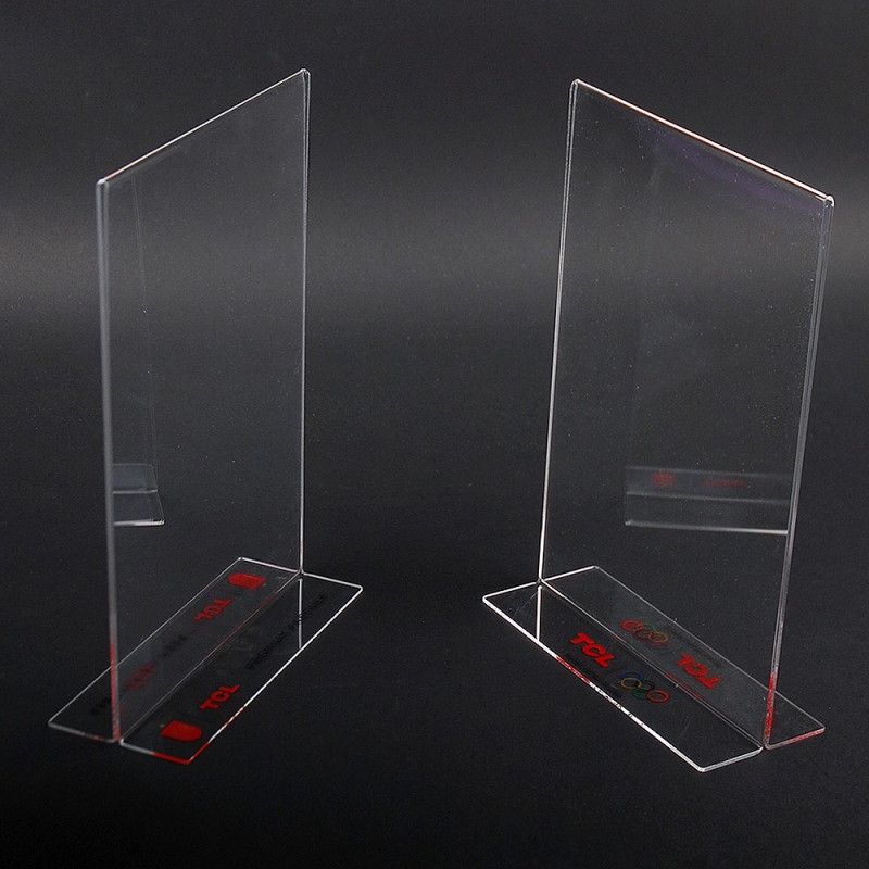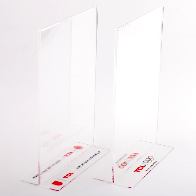 Frames for table or counter customized and handcrafted with transparent acrylic perspex plates (Plexiglas®-PMMA) to place and present interchangeable sheet visible on both sides. They include digital printing using ECO-UV inks of high quality and resistance with great sharpness of colours of wide depth. Smooth, polished, colourless, extra-glossy edges.