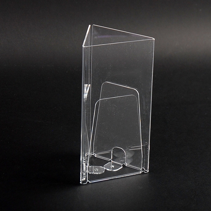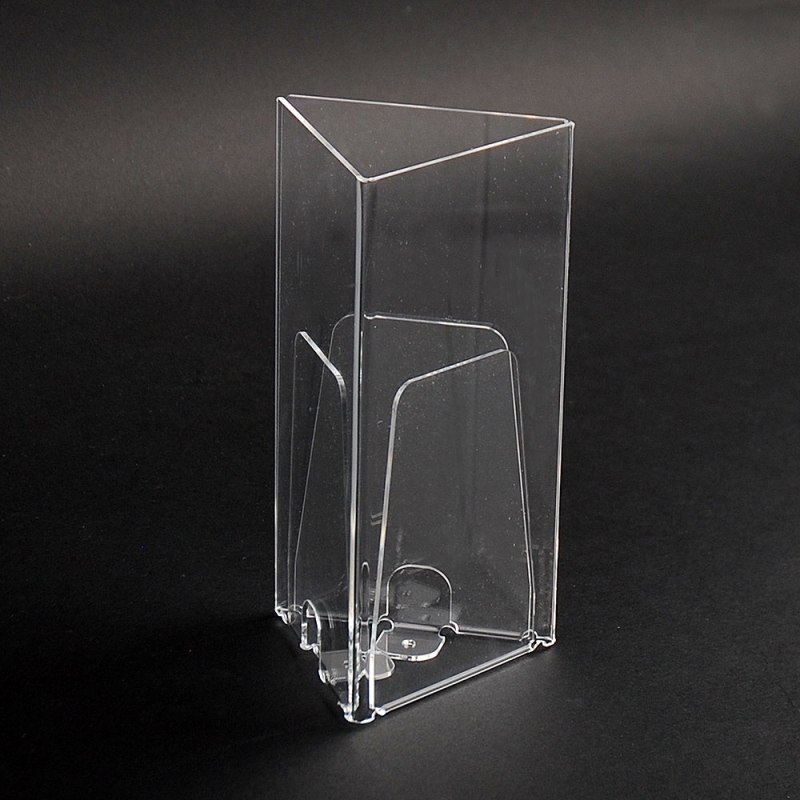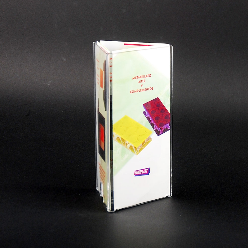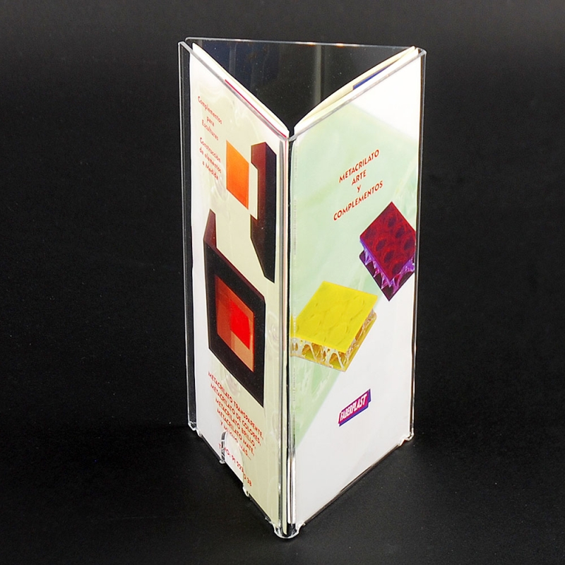 Personalised leaflet holder in 3 SIDES format handmade with transparent acrylic perspex plates (Plexiglas®-PMMA). Includes tabs for fixing with screws. Smooth and polished colourless extra glossy edges. Made in Spain.