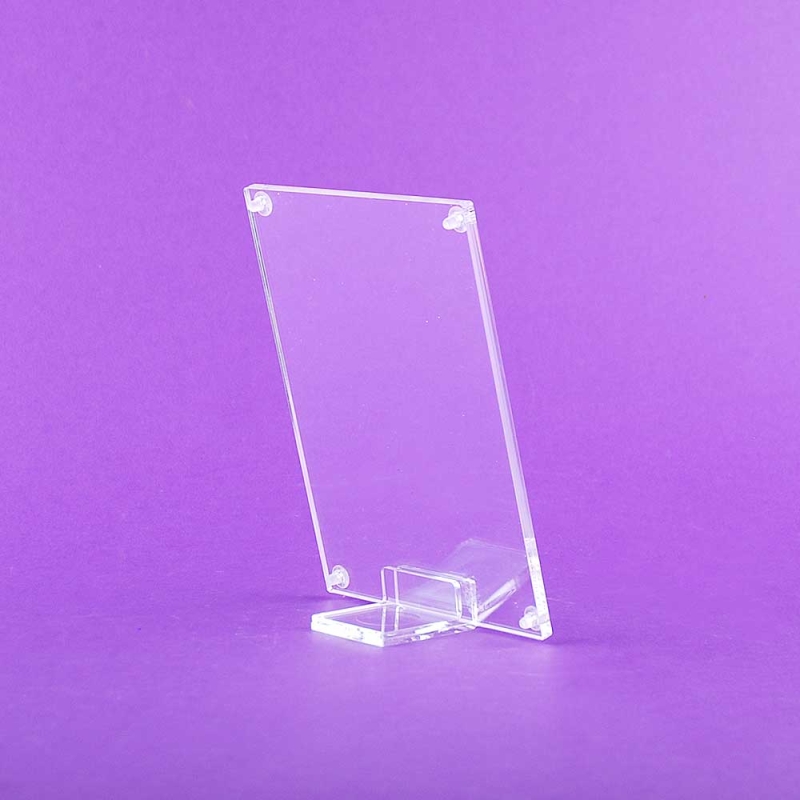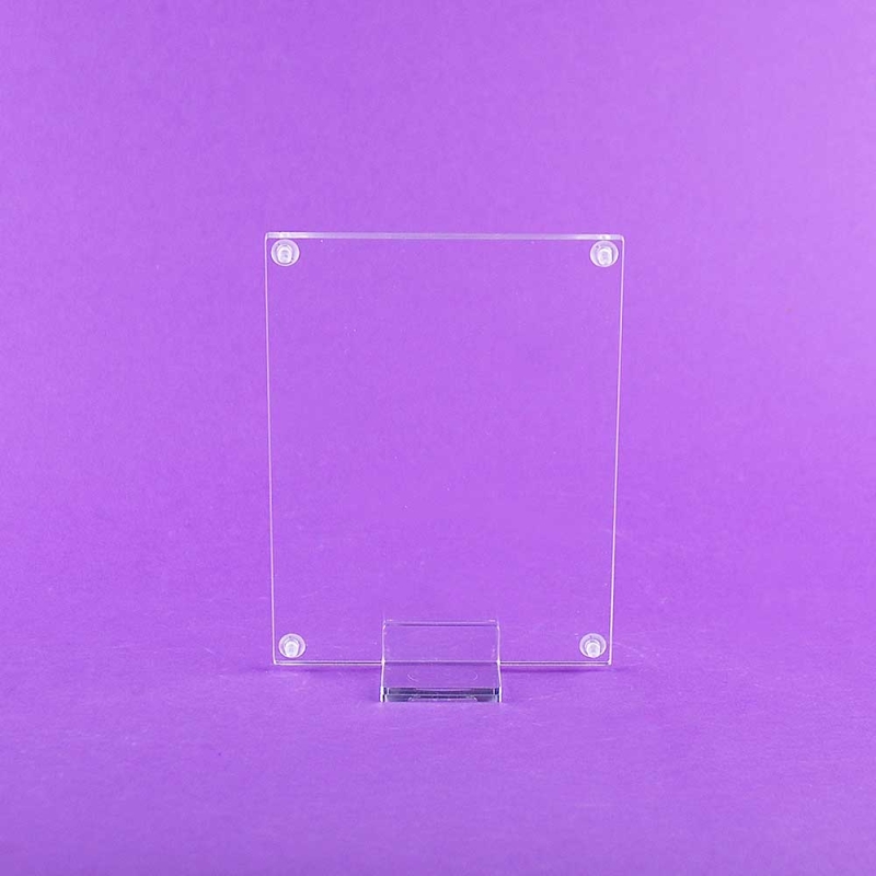 Acrylic plexiglas sheet holder displays with transparent SCREWS AND STAND and through screws, ideal for all types of information, exhibition, decoration or points of sale. All models can be positioned vertically or horizontally. Our technicians are skilled craftsmen and craftswomen. Your advertising, images or information always well cared for and presented with the high transparency of a noble material such as plexiglas - perspex. Made in Spain.