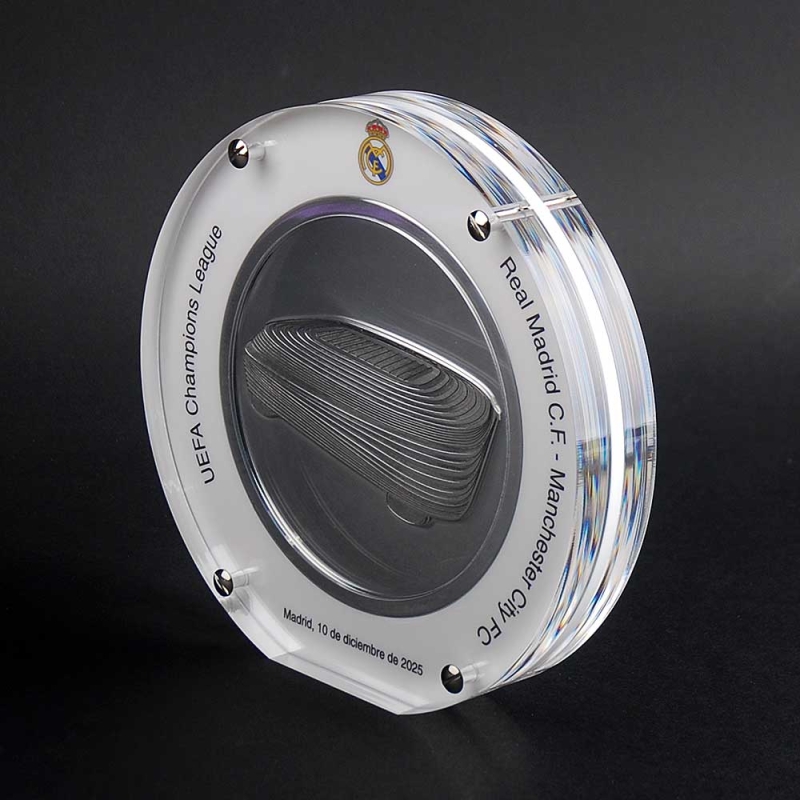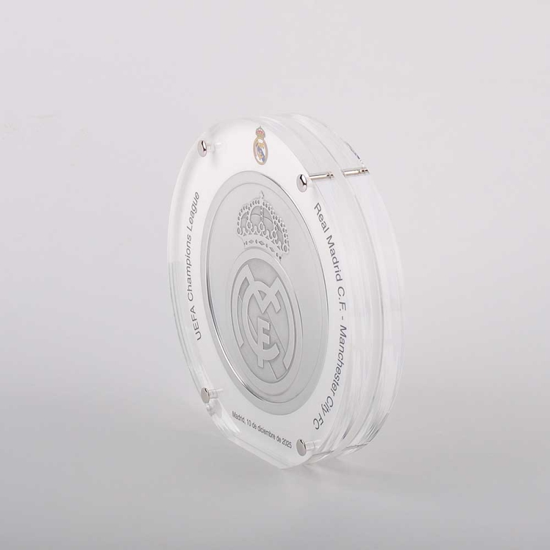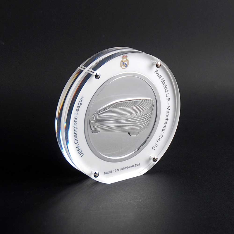 An elegant, circular acrylic tombstone, ideal for sports awards, institutional events, and high-profile occasions. Made of high-quality, transparent acrylic (Plexiglas®-PMMA), it combines several layers assembled with metal spacers, providing depth, solidity, and a premium finish.