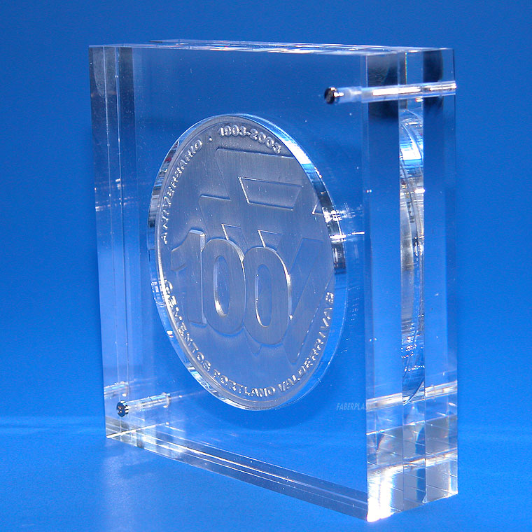 Exclusive corporate gift item to mark the 100th anniversary of the company. Pieces made of transparent perspex plates (Plexiglas-pmma) silhouetted by laser, hand-encased by hand for placement of silver coin and joined with silver pins.