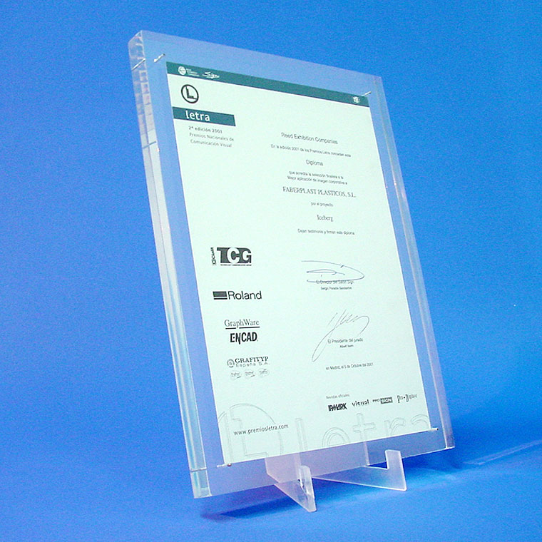 Manufactured with perspex plates (Plexiglas-pmma) high thickness to expose, fix and keep a diploma document on one side, with a perspex base and joined by steel pins.
