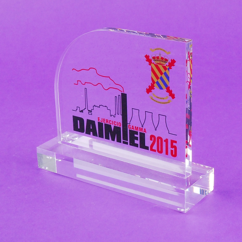 Trophies in block format with curved corner handmade with transparent acrylic perspex plates (Plexiglas®-PMMA) of high thickness in our workshops. Made in UE. With digital printing and high quality ECO-UV inks, sharp and deep colors true to the design provided by the customer. Smooth and polished colorless edges with high gloss thanks to our meticulous working techniques.