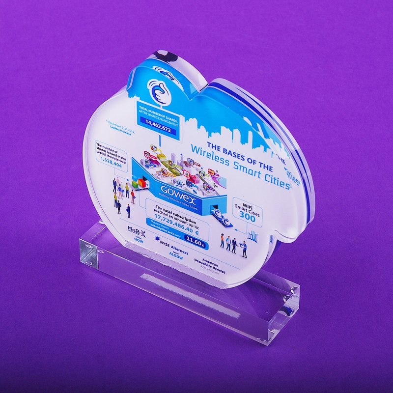 Custom trophies for the company as GOWEX. Made of clear acrylic perspex (Plexiglas, PMMA), silhouetted by laser and labeled under clients corporate design using high resolution digital printing for two-sided.