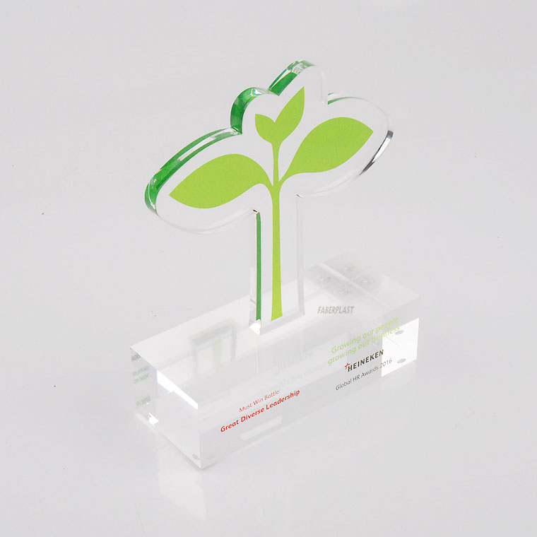 Acrylic plexiglas Trophy made to measure for the company HEINEKEN. Made with transparent perspex plates (Plexiglas-Pmma) silhouetted by laser with shape according to customer's instructions. Decorated with direct digital printing with logo, texts and company design.
