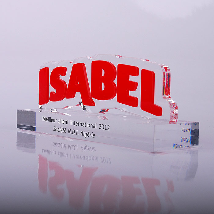 Custom corporate PERSPEX trophy for food brand event: ISABEL.