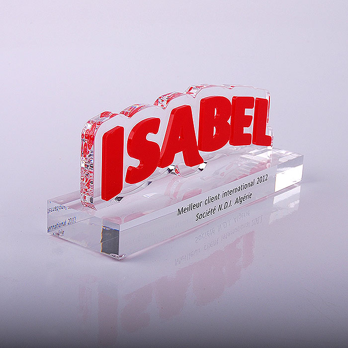Made with transparent perspex plates (plexiglas-pmma) and high gloss red perspex laser embossed. They include customization of texts in the base with digital printing directly printed on the perspex piece.