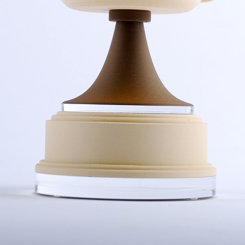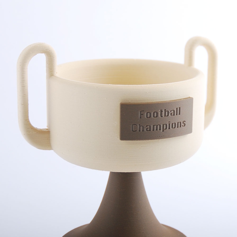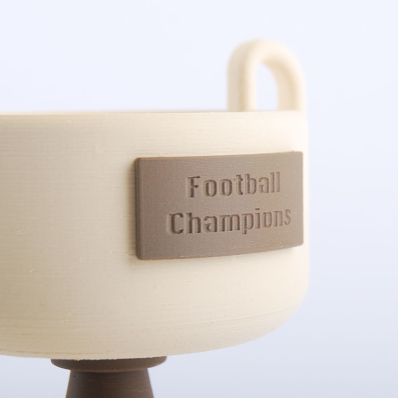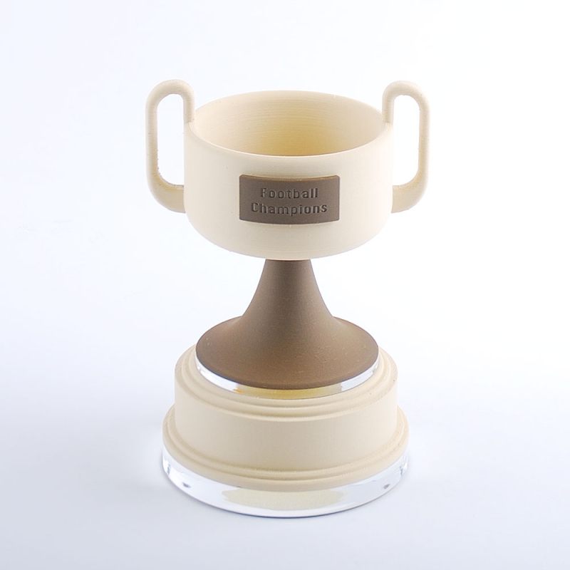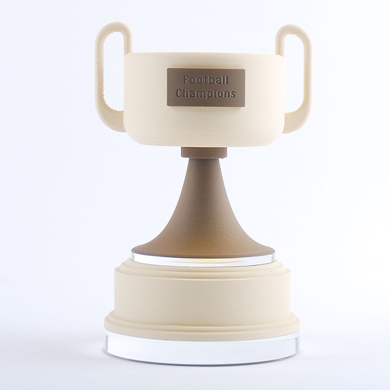 FOOTBALL trophy cup made with transparent methacrylate base (Plexiglas®-pmma) of high thickness and PLA wood two shades (Polylactic Acid). Craftsmanship made with high quality technology in FDM 3D printing. Includes low relief engraving on curved plate.