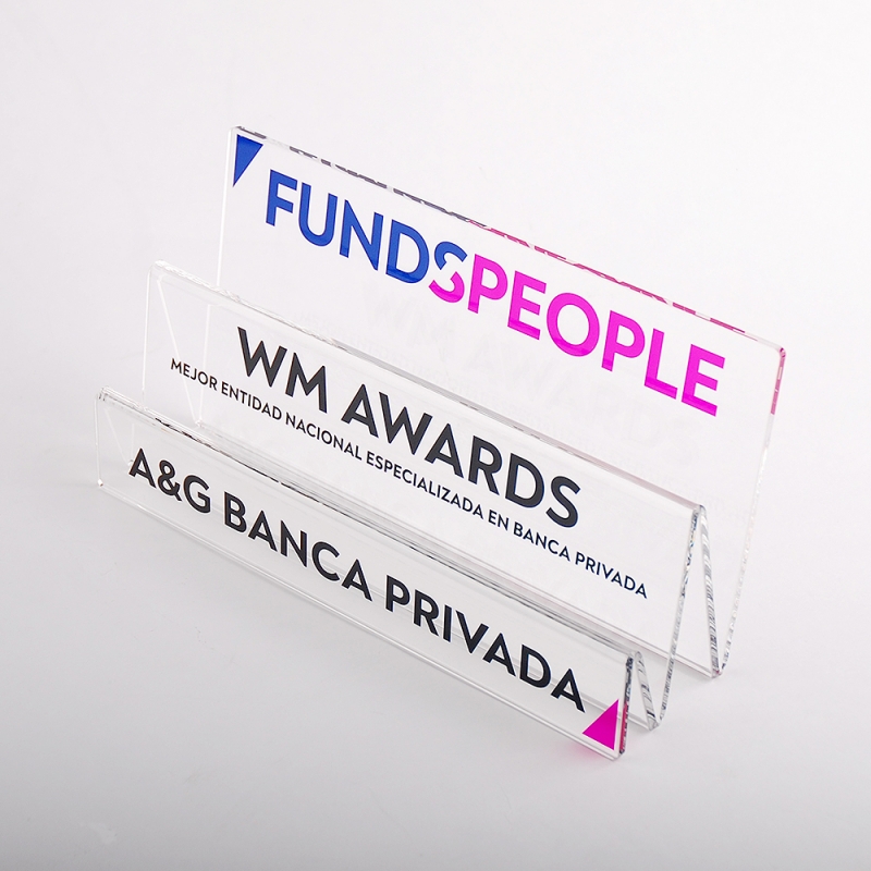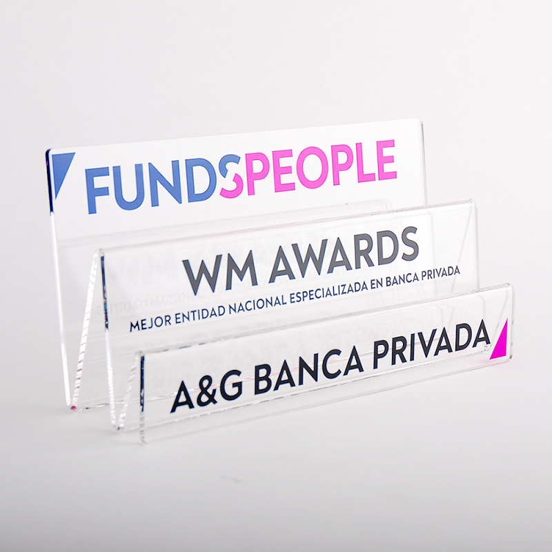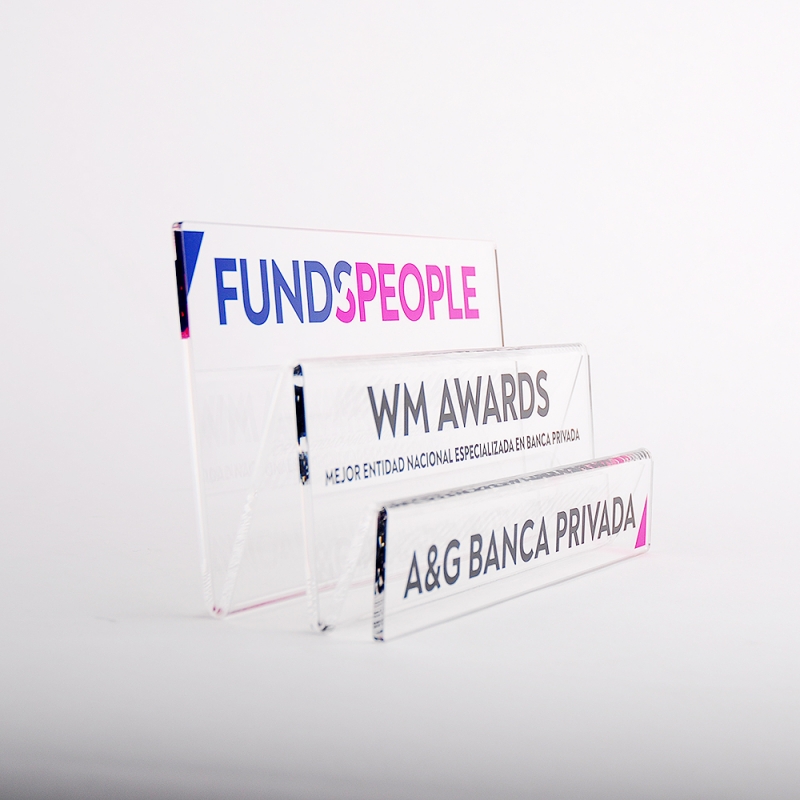 Awards with staggered design handmade with transparent acrylic perspex plates (Plexiglas®-PMMA) in our own workshops. Made in EU. With digital printing and high quality ECO-UV inks, sharp and deep colours faithful to the design provided by the customer. Smooth and polished colourless edges with high gloss thanks to our meticulous work techniques.