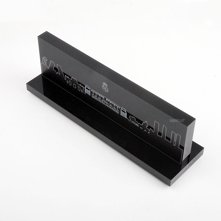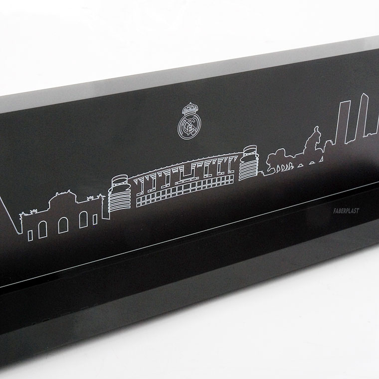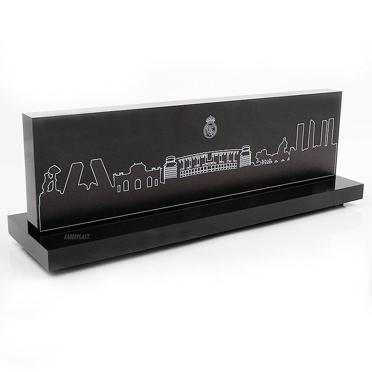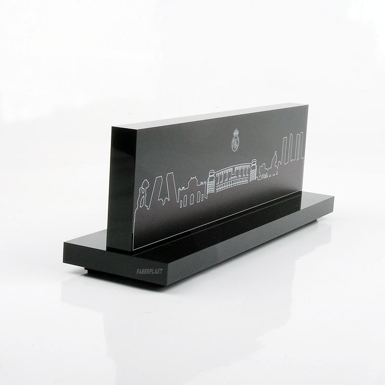 Manufactured with high gloss black PERSPEX plates (Plexiglas - PMMA) and high thickness, with a beautiful design on both upper parts made with direct digital printing with matt white ink. Design facilitated by the client with silhouettes of the main monuments of the city of Madrid and the client's logo.