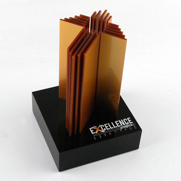 Acrylic plexiglas trophy made for the cocktail competition: EXCELLENCE PROJECT. Made with black perspex plates and glossy gold (Plexiglas-pmma). With high-quality direct digital printing on the base with customer supplied design.