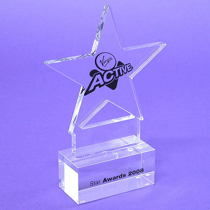 Trophy VIRGIN, made in Acrylic plexiglas (Perspex-pmma) and decorated with silk screen printing.