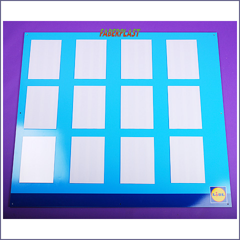 Panels for wall placement media LIDL brand blade holder. Made Foamapan White (PVC foam) and clear acrylic perspex (Plexiglas, PMMA). Labeled with digital printing and customer corporate logo.
