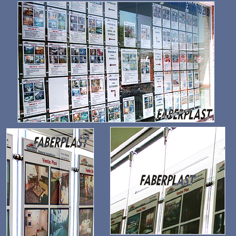Tensor system MADECASA. With transparent methacryalte folders (Plexglas-PMMA) in several sizes and formats and steel cables from ground to ceiling.