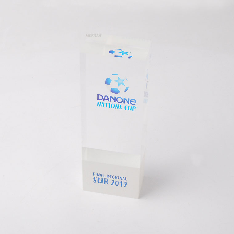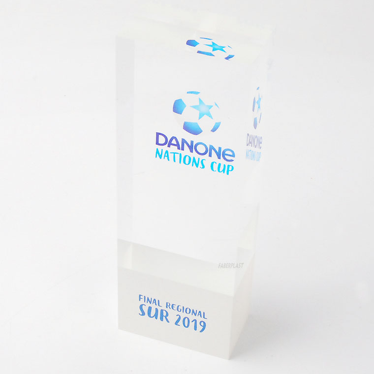Elegant and sturdy perspex trophy bloc made to measure for the prestigious DANONE NATIONS CUP children's soccer competition.