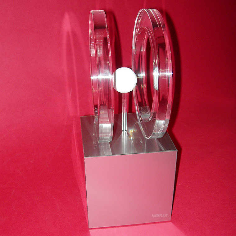 Manufactured with transparent perspex plates (Plexiglas - PMMA) and gloss silver gray perspex plates (Plexiglas - PMMA). It includes laser engraving of text on a cube-shaped pedestal and placement of a golf ball printed by the client.