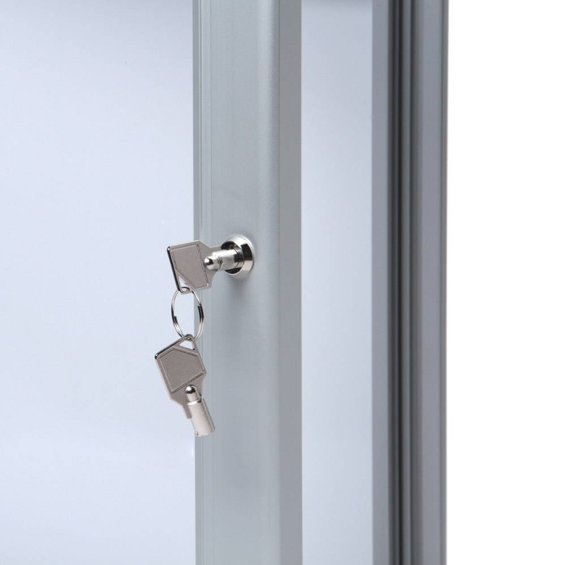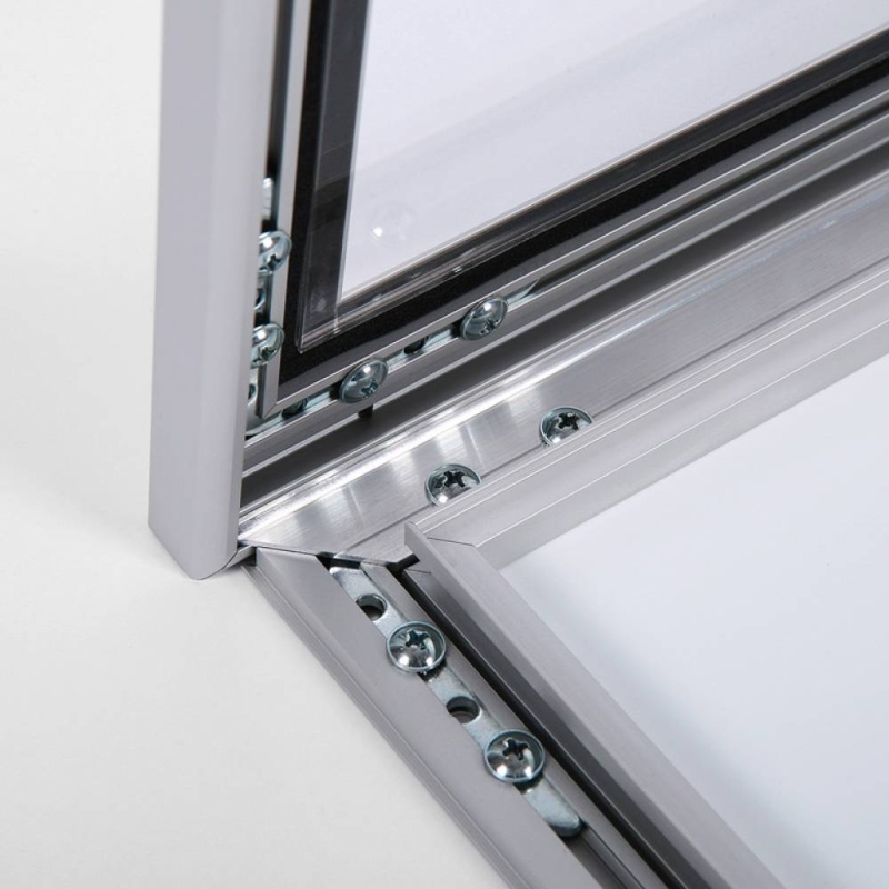 Silver outdoor notice board with lock, ideal for displaying brochures or flyers. A durable system suitable for mounting on walls, fences, or freestanding posts. Attractive display case with an aluminum frame and polycarbonate sheet, perfect for outdoor use. Sheets are held in place with magnets. Ensure your advertisement is always visible, anytime, anywhere, thanks to this lockable, weather-resistant outdoor notice board!